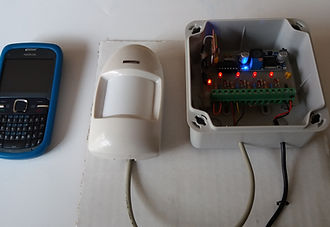Alarma que al detectar movimiento o apertura de puertas en cualquiera de las 4 zonas seleccionadas, llama y envía un mensaje de texto inmediatamente vía módulo GSM a 3 teléfonos celulares previamente registrados.